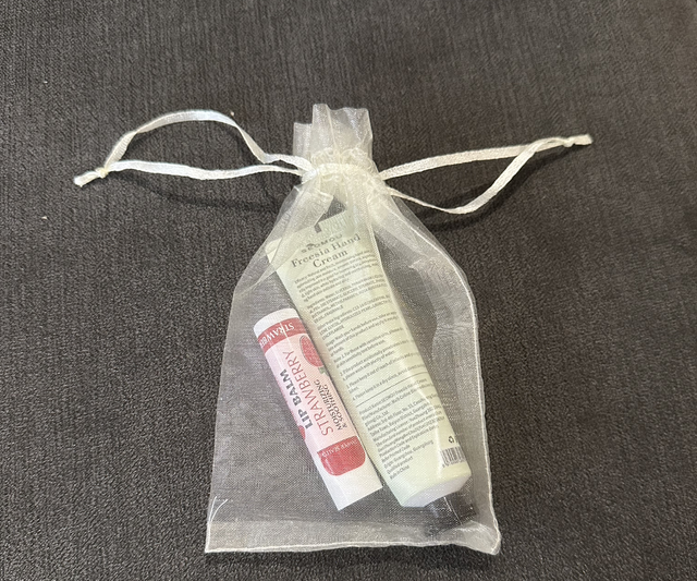 Facemask, Small handbag mirror, 2 x Mini towels, Nail care kit, eye and lip mask, mini wet wipes, lip mask, 3 x mini body scrubs (Shea, peach and milk), 2 x hand soap, mini hand cream, lip and hand cream set, shower glove, make up sponge and mini seaweed mask all in a hand gift bag.
